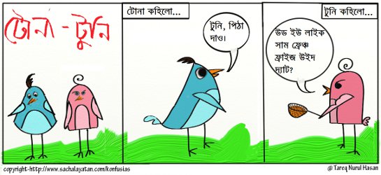 টোনা কহিল টুনি পিঠা দাও। টুনি কহিল, আগে সচল হও (তারপর থেকে টোনা দিনরাত দলছুট নামে সচলে পদ্য লেখে) ।