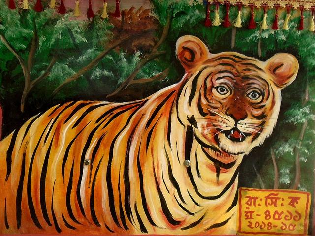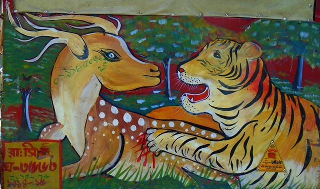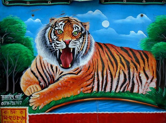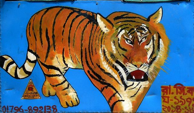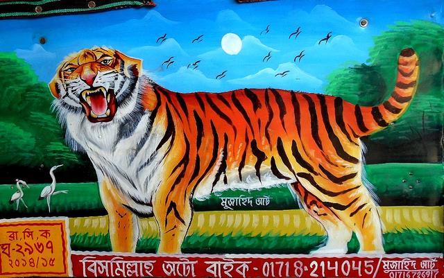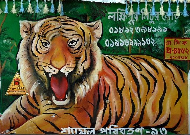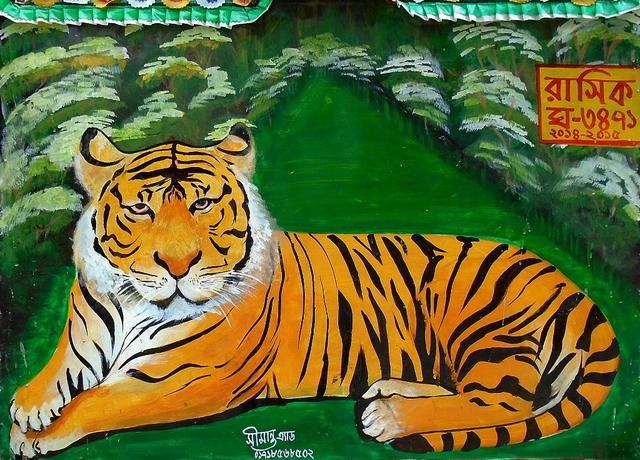বাঘের যত্নআত্তিতে আমাদের খেয়াল না থাকলেও বাঘ নিয়ে আর নিজেদের বাঘা বাঙ্গালী হিসেবে জাহির করার আস্ফালনের কোন কমতি নেই। ক্রিকেট খেলায় ছিনাথ বহুরূপীর মত বাঘ সেজে আমাদের বাঘা খেলোয়াড়দের উৎসাহ দিয়ে, বাঘকে জাতীয় পশুর খেতাবে ভূষিত করে, নিজেদের বাঘেরবাচ্চা বলে নিজেদেরই পিঠটা চাপড়ে দিয়ে যে আত্মসন্তোষে আমরা মগ্ন হয়ে আছি তাতে রয়েল বেঙ্গল টাইগারের ক’পয়সা লাভ-ক্ষতি সে হিসাব কষবো এমন বিদ্যা-বুদ্ধি ঘটে নেই। তাই ভাবছি বাঘের ছবিই দেখাই। কয়েক প্রজন্ম পর বাঘের ছবিতে ফুলের মালা চড়াবার সময় যখন এসে যাবে তখন আমাদের আণ্ডা-বাচ্চাদের এই সব ছবি দেখিয়েই বলতে হবে বাপধন এই দেখো বাঘ। আপাতত রাজশাহীর রিকশার ছবিতে কত রূপে বাঘমামা এসেছেন তাই দেখা যাক। রিকশার পেছনের টিনের চৌকো ক্যানভাস জুড়ে বাঘের ছবি খুবই জনপ্রিয়। অন্য পশুদের চেয়ে বাঘের ছবিই আঁকা হয়েছে বেশি। হয়তো বাঘের রাজকীয় চেহারা আর এই টাইগারের সাথে বেঙ্গল শব্দ জুড়ে যাওয়ায় বাঘ আমাদের বা আমরাই বাঘ এই জাতীয় একটা আত্মতৃপ্তি থেকেই বাঘ নিয়ে আমাদের বাগাড়ম্বর কম নয়। এখন বাঘ নিয়ে আমাদের টিন ক্যানভাসের শিল্পীদের ছবির আড়ম্বর দেখা যাক।